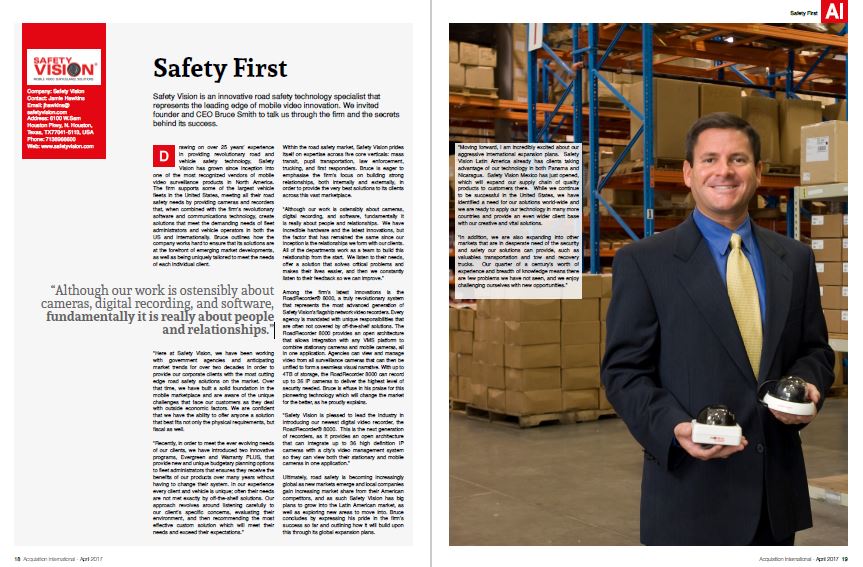 Acquisition International Magazine (April 2017) interviewed Safety Vision's founder and CEO Bruce Smith on how 25 years of experience has provided the vehicle industry with a leading edge of mobile video innovation.