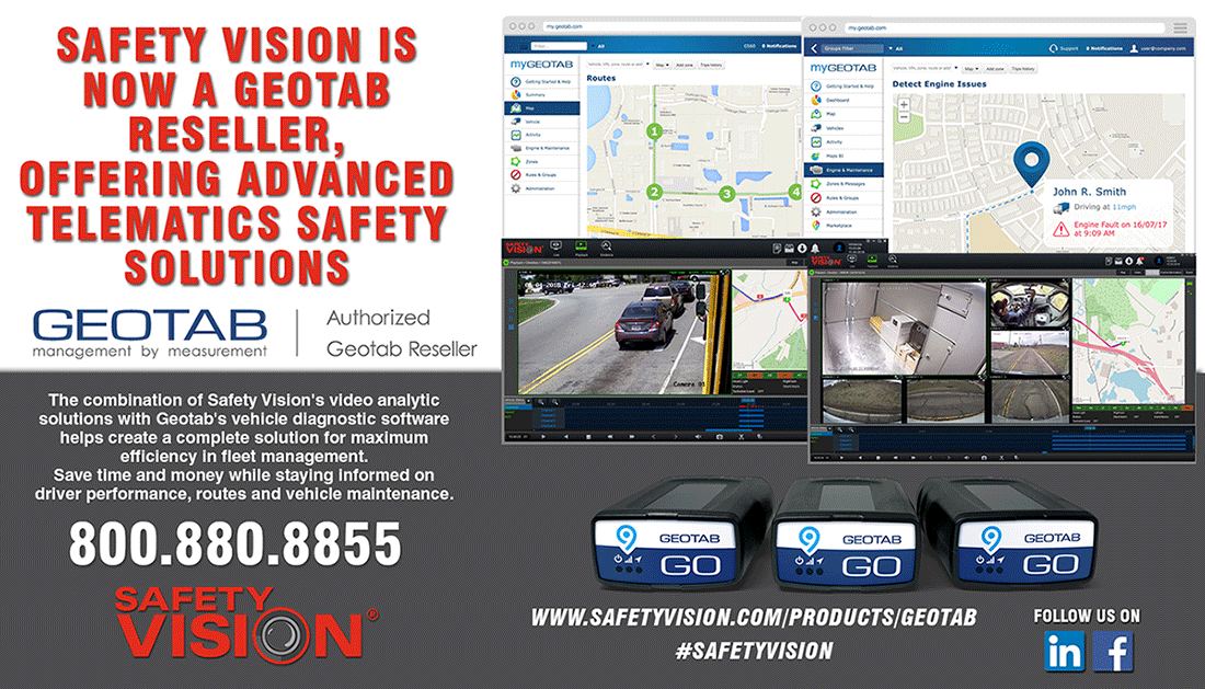 Geotab's intuitive open platform solution helps protect businesses by tracking fleets, scoring drivers and running vehicle diagnostics. While Safety Vision’s suite of sophisticated recorders, monitors, cameras and software help to reduce financial threats, encourage safer driving and improve operational efficiency. Together, Geotab and Safety Vision’s innovative products provide an all-encompassing fleet management solution that saves customers’ time and money while staying informed on driver performance, routes and vehicle maintenance.