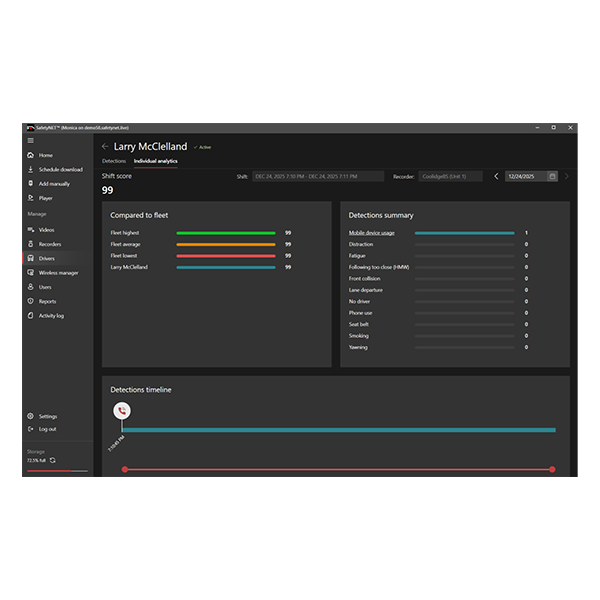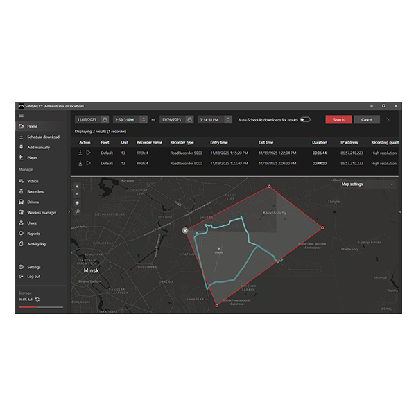 Users can play back recordings directly from online recorders without first downloading the entire file to the server. Location-based search tools allow users to draw custom geographic regions on a map to locate relevant video, view vehicle trail history, and access footage immediately or schedule retrieval based on recorder connectivity. Additional features such as Entra ID (Microsoft 365)/Windows Server Active Directory integration, driver scoring, wireless downloads, custom email reports, dewarping, and multiple export options make SafetyNET a comprehensive Video Management System for modern fleet operations.