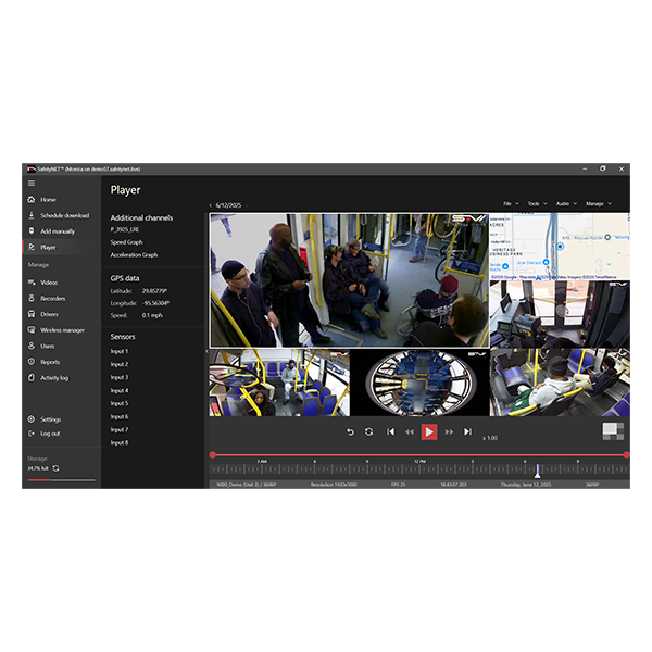 SafetyNET is an enterprise Video Management System (VMS) with a client-server architecture, for use with vehicles equipped with Safety Vision's lineup of network video recorders (NVR) and hybrid video recorders (HVR). Designed for remote access via Wi-Fi or cellular networks, SafetyNET enables real-time vehicle tracking, live camera viewing, and access to recorded video through an intuitive interface. Built to scale with fleet operations, SafetyNET provides advanced tools for video retrieval, reporting, and system oversight within a single application.